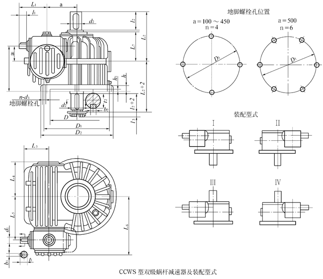 CCWS型雙級蝸桿及齒輪-蝸桿減速器(JB/T7008-1993)由兩類產品構成,其中ZC1型雙級蝸桿減速器是由速比及規格不同的兩級圓弧圓柱蝸桿傳動組成;齒輪—蝸桿減速器是由高速級為圓柱齒輪傳動、低速級為圓弧圓柱蝸桿傳動的兩級傳動組成