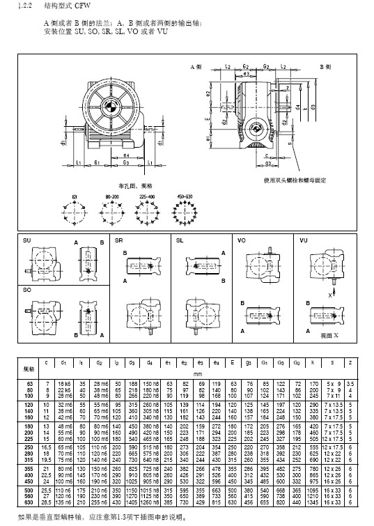 CFW蝸輪蝸桿減速機廣泛應(yīng)用于礦山、建筑、石油、冶金等重型行業(yè),其傳動扭矩大、傳動效率高、使用壽命長等特點在國內(nèi)得到大力推廣,CFW減速機為環(huán)面蝸桿傳動系列,制造工藝相對復雜所以價格較高。 CFW蝸桿減速機采用輸出軸并配有輸出法蘭連接,隨意安裝。用戶選擇時可根據(jù)實際使用需要選擇合適的安裝方式,具體安裝形式及安裝尺寸如下圖所示