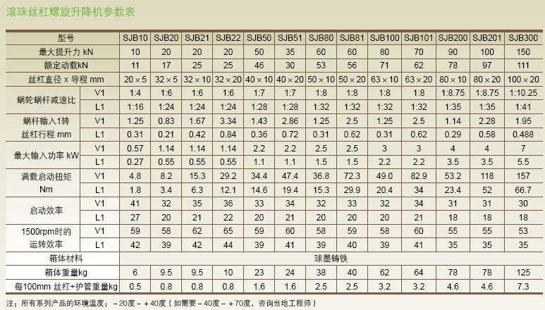 SJB系列滾珠絲杠螺旋升降機(jī)產(chǎn)品的壽命主要由滾珠絲杠的壽命及蝸輪蝸桿等零部件壽命決定;我們主要校核滾珠絲杠的壽命,蝸輪蝸桿會(huì)有磨損,但壽命一般比滾珠絲杠長(zhǎng)。滾珠絲杠的預(yù)期壽命L10是90%的滾珠絲杠在金屬材料疲勞失效前所能達(dá)到或超過的運(yùn)行距離。單位為百萬毫米。滾珠絲杠預(yù)期壽命L10并非是保質(zhì)承諾,同時(shí)壽命的預(yù)期要在正確的維護(hù),無污染物和正確的潤(rùn)滑。