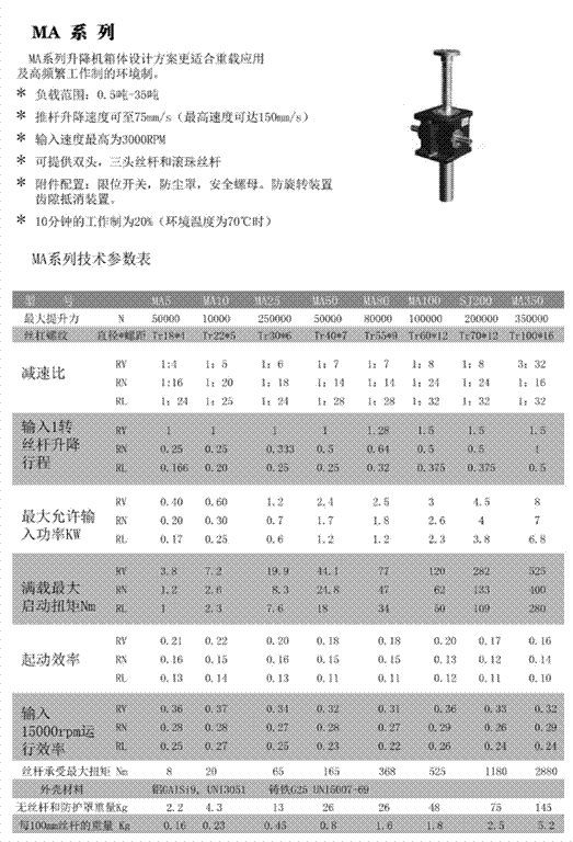 MA系列普通齒螺旋升降機 更適合重載應用:重負荷,高頻繁工作制 額定負載: 0.5噸 -35噸 推桿升降速度可至75mm/s 最高輸入轉(zhuǎn)速: 3000rpm 工作制:30%(10分鐘運行3分鐘) 可選擇雙頭,三頭絲杠配套,參數(shù)咨詢我公司 附件:齒隙抵消裝置,防轉(zhuǎn)轉(zhuǎn)置,安全螺母,防塵罩,磁感應限位開關(guān)