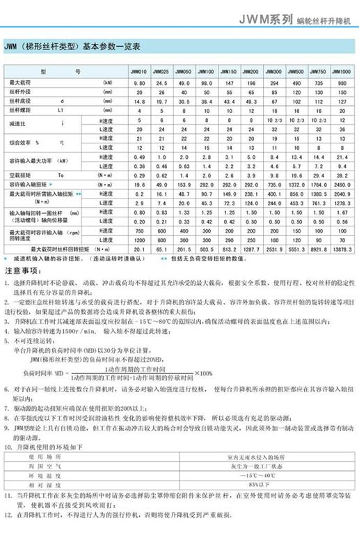 JWM升降機(jī)(梯形絲桿類(lèi)型)基本參數(shù)一覽表