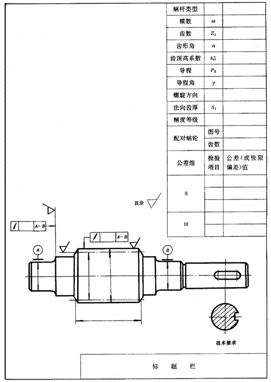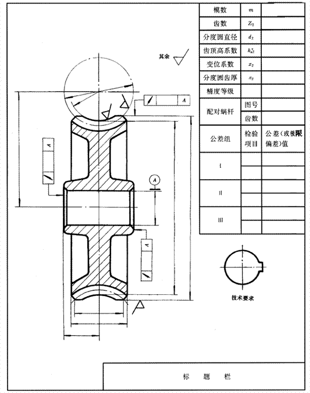 根據蝸桿、蝸輪的具體結構形狀及其技術條件的要求,還應給出其他在加工和測量時所必需的數據。蝸桿、蝸輪圖樣的繪制應符合GB4459.2的規定。圖樣中的參數表一般放置于圖面的右上方,參數表中列出的數據項目可根據需要增減,檢驗項目則按使用要求和用戶意見根據GB10089和有關標準的規定確定。圖樣的技術要求一般放置于圖面的右下方。