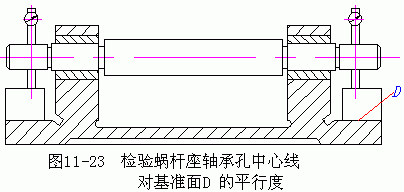 蝸桿座基準(zhǔn)面D可用專用研具刮研,研點(diǎn)應(yīng)為8~10/25×25mm2。檢驗(yàn)軸承中心線對(duì)D面的平行度,如圖11—23所示,符合要求后裝入蝸桿,配磨調(diào)整墊片(補(bǔ)償環(huán)),以保證蝸桿軸線位于蝸輪的中央截面內(nèi)。與此同時(shí),徑向調(diào)整蝸桿座,達(dá)到規(guī)定的接觸斑點(diǎn)后,配鉆鉸蝸桿座與底座的定位銷孔,裝上定位銷,擰緊螺釘。側(cè)隙大小的檢查,通常將百分表測(cè)頭沿蝸輪齒圈切向接觸于蝸輪齒面可工作臺(tái)相應(yīng)的凸面,固定蝸桿(有自鎖能力的蝸桿不需固定),搖擺工作臺(tái)(或蝸輪),百分表的讀數(shù)差即為側(cè)隙的大小。