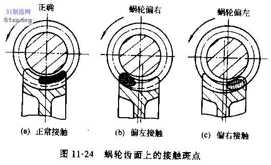 蝸輪齒面上的接觸斑點(diǎn)應(yīng)在中部稍偏蝸桿旋出方向,如圖11—27a所示,若出現(xiàn)圖11—23b、圖11—23c的接觸情況,應(yīng)配磨墊付片調(diào)整蝸桿位置使用權(quán)其達(dá)到正常接觸。接觸斑點(diǎn)長(zhǎng)度,輕負(fù)荷時(shí)一般為齒寬的25%~50%,不符合要求時(shí),可適當(dāng)調(diào)節(jié)蝸桿座徑向位置。全負(fù)荷時(shí)接觸斑點(diǎn)長(zhǎng)度最好能達(dá)到齒寬的90%以上。